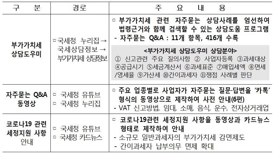 코로나19 이후에 사회적 거리두기, 재택근무 등으로 호황을 누리는 비(非)대면 소비 관련 사업자(구독 서비스, 라이브 커머스 등)에 대해 신고도움자료도 제공하고 있다.