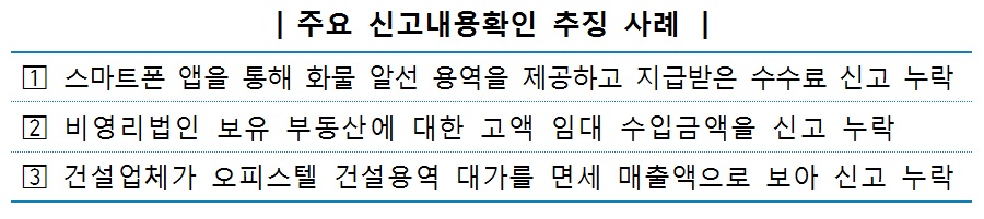 특히 지속적으로 세금탈루가 적발되는 유형에 대해 더욱 면밀한 검증을 실시하기로 했다. 예를 들어, 스마트폰 앱을 통해 화물 알선 용역을 제공하고 지급받은 수수료 신고를 누락하거나, 비영리법인 보유 부동산에 대한 고액 임대 수입금액을 신고·누락한 사례 등이 해당된다.