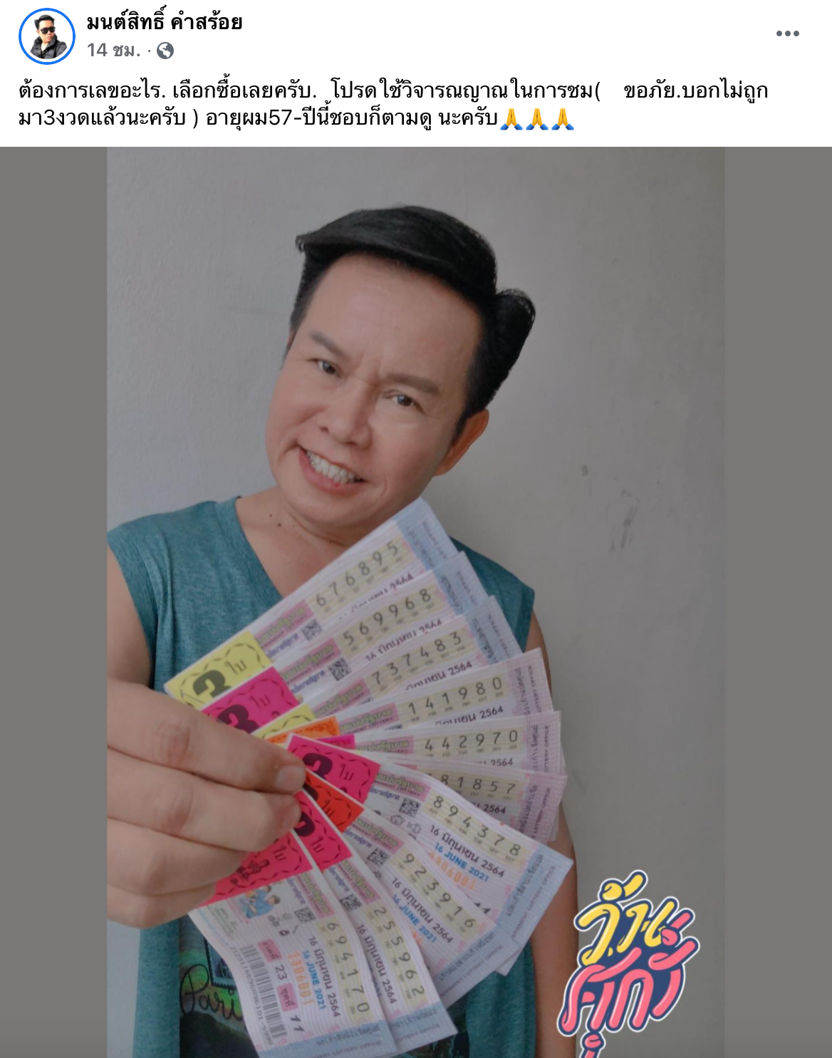 ก่อนวันหวยออก นักร้องลูกทุ่งชื่อดัง มนต์สิทธิ์ คําสร้อย มักไม่พลาดที่จะมาบอกเลขที่ชอบให้แฟนๆ ได้รู้ ล่าสุดเขาก็ได้โพสต์ภาพขณะถือลอตเตอรี่หลายใบในมือ พร้อมบอกว่า