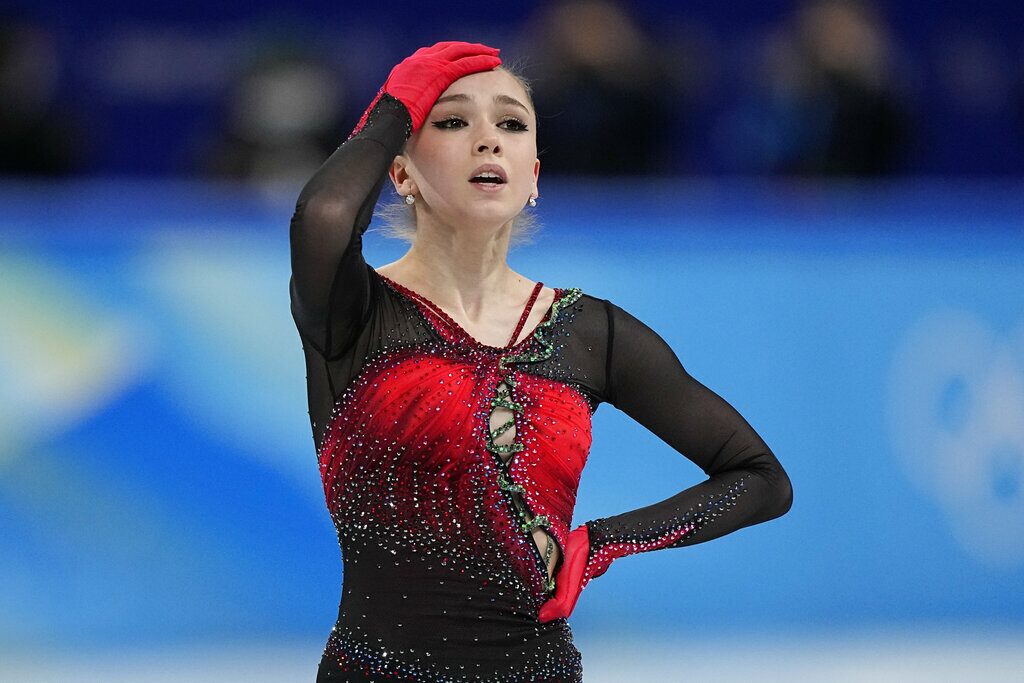 Kamila Valieva, of the Russian Olympic Committee, reacts in the women’s team free skate program during the figure skating competition at the 2022 Winter Olympics, Monday, Feb. 7, 2022, in Beijing. (AP Photo/David J. Phillip)
